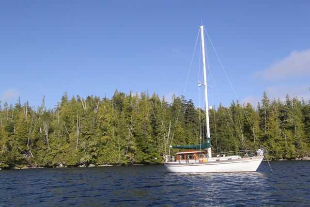 Glassy calm as we left Port McNeill. I scrambled to get off a bunch of emails before we left range and Scott landed a nice 6 pound spring salmon. Headed across the strait. Waves turned to rollers. We saw a huge otter in the middle of what seemed like nowhere. The wind behaved itself and we got used to the rolling motion of the open ocean. Found our way into the outer coastal islets. Now we feel like we’re getting North. Wind pummelled trees. Booming waves. Bare rock faces. We were feeling adventuresome and so took the advice of the cruising guide and crept in slowly to Murray’s Labyrinth. Tricky entry, but not too bad with someone on the bow – a wonderful lagoon of moss laden trees, crevassed rocks, kelp forests. Broke in the new dinghy engine with a slow exploration. Had the whole place to ourselves.