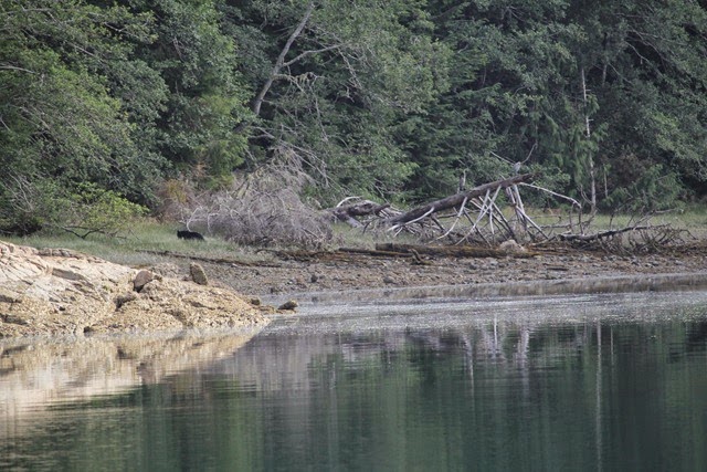 Bear on the beach this morning, followed by a good exploration of the old village. Mostly overgrown now, but still paths throughout and we at least found one old totem laying down in a a state of decay. The area must have been an orchard at one point, because there were huge cherry trees. Salmon berries. Bear scat.